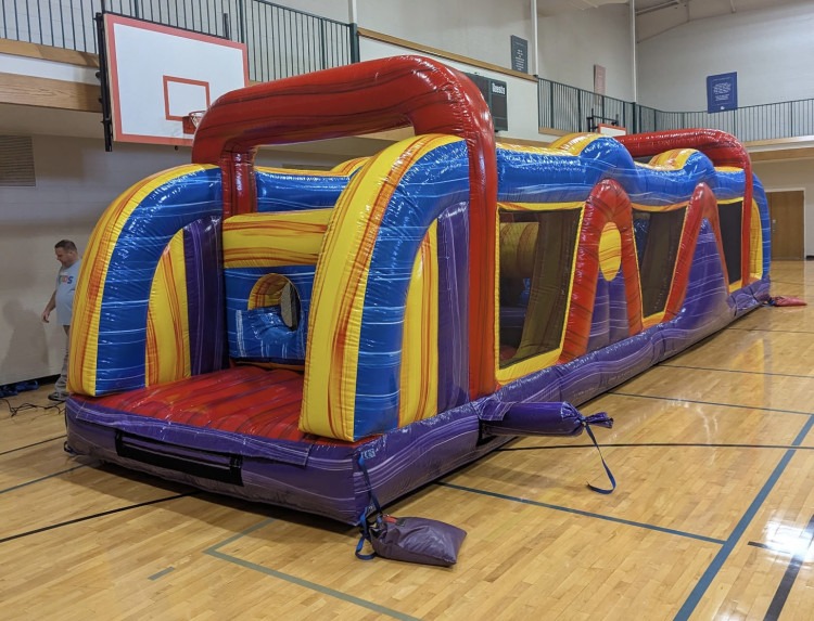 This beautiful 40’ obstacle from EZ Inflatables has everything that you need for a great party. An interior rock climbing slide, horizontal obstacles, punching bags and crawl tubes will wear your party goers out. This is a great obstacle course for a wide variety of ages.